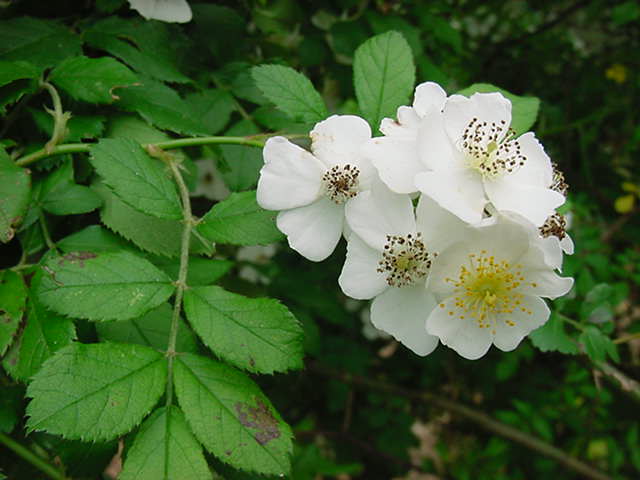 common shrub with thorny stems and pink or white flowers. It grows wild in